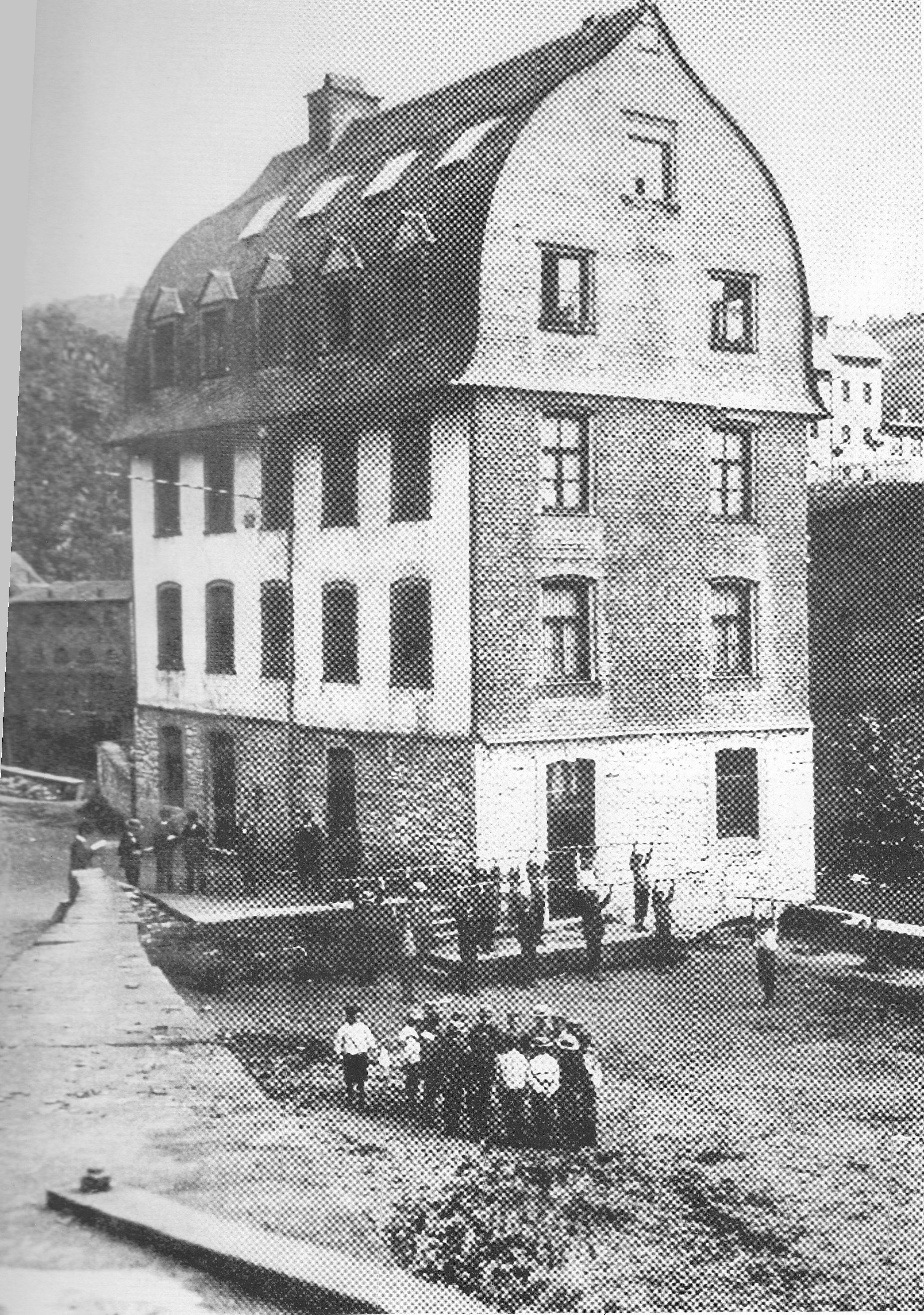 David Friedrich Hansemann (1790–1864) held his first job in this house from 1810 to 1815. Later, Hansemann became one of the leading figures of political and economic liberalism in the Rhineland and, in 1848, served as Prussian Finance Minister. In 1825, he founded the Aachen Fire Insurance Company, today known as the Aachener und Münchener Versicherung, as well as the “Aachen Association for the Promotion of Diligence.” Monschau owes this association its first kindergarten (1842) and the Bischof-Vogt-Haus (1896/97).After the closure of the Elbers cloth company in mid-1886, the house served from May 1, 1895, until November 29, 1924, as the premises of the higher municipal boys’ school. The spacious gymnasium was located on the ground floor, classrooms on the first and second upper floors, and the assembly hall in the attic, which was illuminated by numerous windows. In its opening year, the school had 40 pupils in four classes and three full-time teachers. For comparison: in June 1896, the two three-class elementary schools for boys and girls in Monschau each employed three teachers, instructing 126 boys and 166 girls respectively. An additional 20 children were taught in the one-class Protestant elementary school.